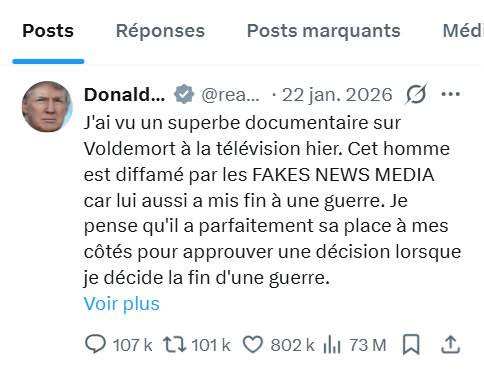 Donald Trump a tweeté à ce sujet : “J’ai vu un superbe documentaire sur Voldemort à la télévision hier. Cet homme est diffamé par les FAKES NEWS MEDIA car lui aussi a mis fin à une guerre. Je pense qu’il a parfaitement sa place à mes côtés pour approuver une décision lorsque je décide la fin d’une guerre.”