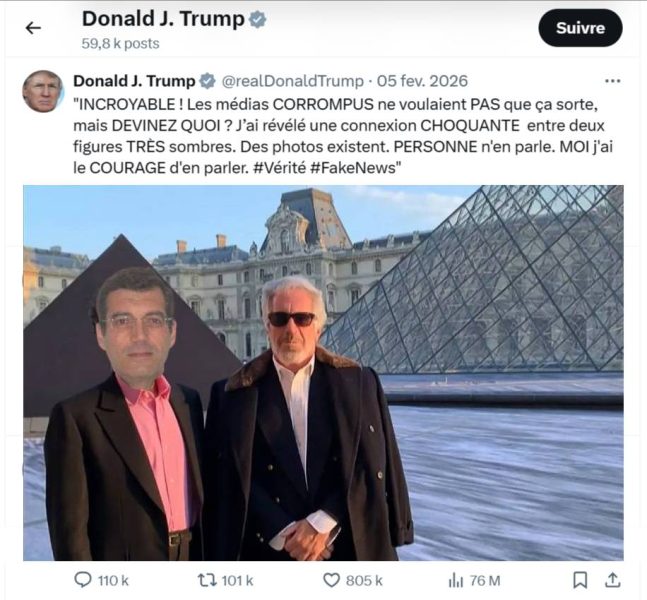 Donald Trump s’est fendu d’un de ses fameux messages sur son réseau “Truth Social” et d’un Tweet : “INCROYABLE ! Les médias CORROMPUS ne voulaient PAS que ça sorte, mais DEVINEZ QUOI ? J’ai révélé une connexion CHOQUANTE entre deux figures TRÈS sombres. Des photos existent. PERSONNE n’en parle. MOI j’ai le COURAGE d’en parler. #Vérité #FakeNews”